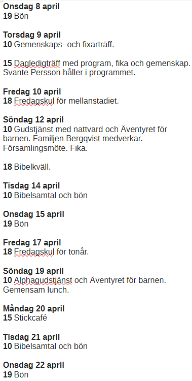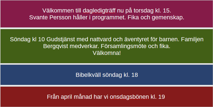Vi har en bibelläsningsplan som du gärna får ta del av. Du hittar den om du klickar här. Den som är aktuell nu gäller för våren - sommaren 2026.